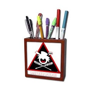 Product Description : DANGER DUDE screwdriver triangle 4 for dark backgrounds Tile Pen Holder is measuring 5w x 5h x 2d. Made from high quality solid mahogany wood with satin finish and one 4.25 commercial grade mirror gloss ceramic tile. Looks great on a desk or counter top with a full color custom imaged tile.