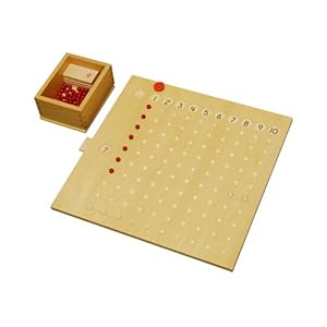 Product Description : Wooden multiplication board with 100 red beads, 10 cards labeled 1-10 and a red disc in a wooden box. The Multiplication Bead Board is used for practice with the multiplication tables 1x1 though 10x10.