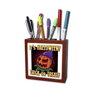 Product Description : JACK O LANTERN its halloween trick or treat 1 on white with gradient Tile Pen Holder is measuring 5w x 5h x 2d. Made from high quality solid mahogany wood with satin finish and one 4.25 commercial grade mirror gloss ceramic tile. Looks great on a desk or counter top with a full color custom imaged tile.