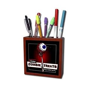 Product Description : ZOMBIES zombie treats 2 on black Tile Pen Holder is measuring 5w x 5h x 2d. Made from high quality solid mahogany wood with satin finish and one 4.25 commercial grade mirror gloss ceramic tile. Looks great on a desk or counter top with a full color custom imaged tile.