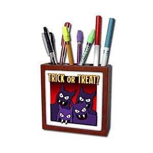 Product Description : HUNGRY VAMPIRES trick or treat 1 on white with gradient Tile Pen Holder is measuring 5w x 5h x 2d. Made from high quality solid mahogany wood with satin finish and one 4.25 commercial grade mirror gloss ceramic tile. Looks great on a desk or counter top with a full color custom imaged tile.