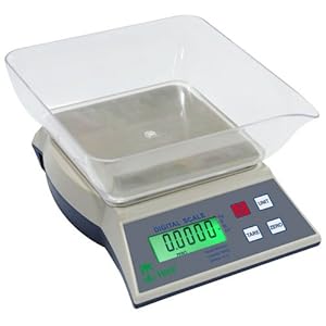 Product Description : 2 year manufacturers warranty. Weigh in pounds, ounces, pounds & ounces, kilograms or grams. Large weighing platform size of 5 3/4 inches. Bowl dimensions = 8 x 8 x 2 1/2 deep. Total scale dimensions w/bowl = 9 x 8 x 6 high. A/C adapter or 6 AA batteries (not included) Large .6 inch LCD digits on indicator Tare/Zero function. Auto shut off feature. (Selectable). Auto backlight. (Selectable).