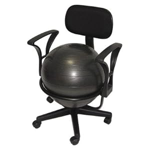 Product Description : Amazon.comThis unique hybrid chair combines a traditional desk chair with an inflatable exercise ball. This ergonomic seating solution promotes active sitting while strengthening the back and improving posture. Compact, lightweight at only 24 pounds, and easy to transport, the chair has a durable steel frame, measures 22-by-31-by-22-inches (W x H x D) and includes a hand pump. Product Description : 35955 Features: -Weight Capacity: Ball in Chair = 300 lbs , Ball Alone = 1250 lbs.-First pre-assemble the chair without screws..-Once assembled, loosely put each screw in and turn it one or two turns..-Once all screws are inserted, tighten all the screws half way then go back and tighten all the screws again..-NOTE:If one screw is tightened completely before the others, some of the pieces might not align properly and the last screw may not fit..-The ball should be filled between 45cm to 50cm DIAMETER; with 48cm being the best diameter. Measure the diameter from the North Pole to the South Pole with a tape measure or a string that is marked in Centimeters. This would be from where you fill the ball on the top to the bottom and you will see where the point should be by the center of the smallest circle. If the ball does not get to 45cm, let it sit for at least 24 hours then continue to fill again.. Dimensions: -Dimensions: 22'' H x 22'' W x 31'' D.-Arm Height: 25'' from floor.