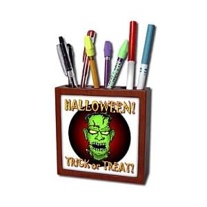 Product Description : FRANKENSTEIN trick or treat 1 on white Tile Pen Holder is measuring 5w x 5h x 2d. Made from high quality solid mahogany wood with satin finish and one 4.25 commercial grade mirror gloss ceramic tile. Looks great on a desk or counter top with a full color custom imaged tile.
