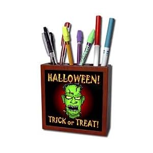 Product Description : FRANKENSTEIN trick or treat 1 on black Tile Pen Holder is measuring 5w x 5h x 2d. Made from high quality solid mahogany wood with satin finish and one 4.25 commercial grade mirror gloss ceramic tile. Looks great on a desk or counter top with a full color custom imaged tile.