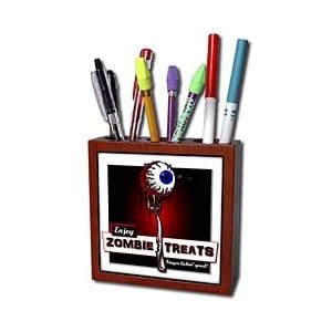 Product Description : ZOMBIES zombie treats 2 on transparent Tile Pen Holder is measuring 5w x 5h x 2d. Made from high quality solid mahogany wood with satin finish and one 4.25 commercial grade mirror gloss ceramic tile. Looks great on a desk or counter top with a full color custom imaged tile.