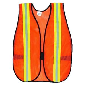 Product Description : Bright orange color and reflective strips provide high visibility day or night for a variety of hazardous situations. Lightweight polyester mesh fabric with hook and loop closure keeps vest secure in all weather conditions. One size, 18" x 47", with 8" elastic side straps. Apparel Type: Vest; Material(s): Polyester Mesh; Color(s): Bright Orange/Lime;Silver Reflective Strips.
